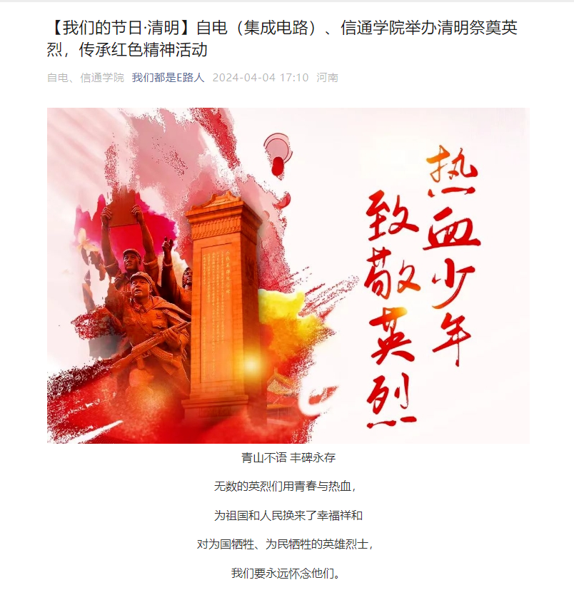 4月4日至6日,学院通过微信公众号发布“【我们的节日·清明】自电(集成电路)、信通学院举办清明祭奠英烈,传承红色精神活动”推送,各党支部、各年级辅导员通过微信群积极转发活动链接,全体党员、师生积极参与网络祭扫、签名寄语等纪念活动,表达对先烈的缅怀之情。