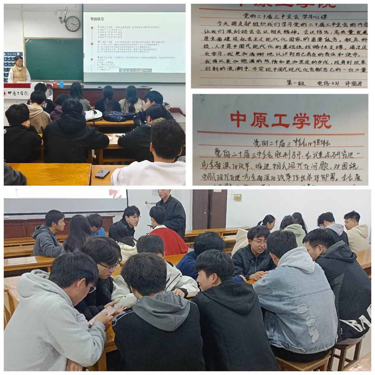 前期,学生干部认真准备,详细解读了党的二十届三中全会的重要意义、主要内容以及深远影响。各班级分别开展小组讨论,立足学生实际,就新时代的大学生如何积极响应党的号召,为实现中国式现代化贡献自己的力量进行交流。